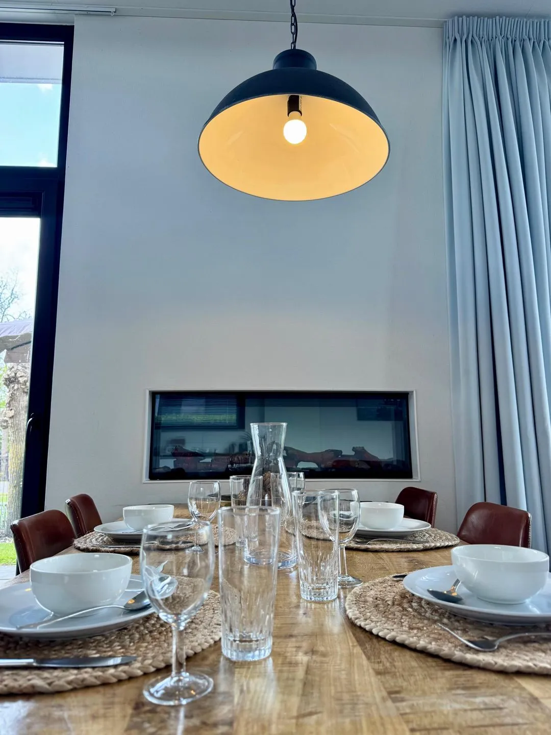 Im Inneren erwartet Sie ein modernes, funktionales Raumkonzept mit Wohnzimmer, Essbereich und einer offenen Küche zum Wohnzimmer. Die Küche ist mit Herd (Gas), Backofen, Mikrowelle, Kühlschrank sowie einem Gefrierfach und Spülmaschine ausgestattet und bietet Küchenutensilien sowie Geschirr und Besteck. Ergänzend stehen eine Waschmaschine und ein Trockner zur Verfügung; die Nutzung von Waschmaschine und Trockner erfolgt gemeinschaftlich. Für Freizeit und Unterhaltung gibt es einen TV mit 44 bis 55 Zoll sowie internationale Kanäle; WLAN ist ebenfalls vorhanden. Ein Kamin bzw. Ofen ist ebenfalls vorhanden, ebenso wie praktische Extras wie Garderobe, Staubsauger, Rauchmelder und Feuerlöscher.